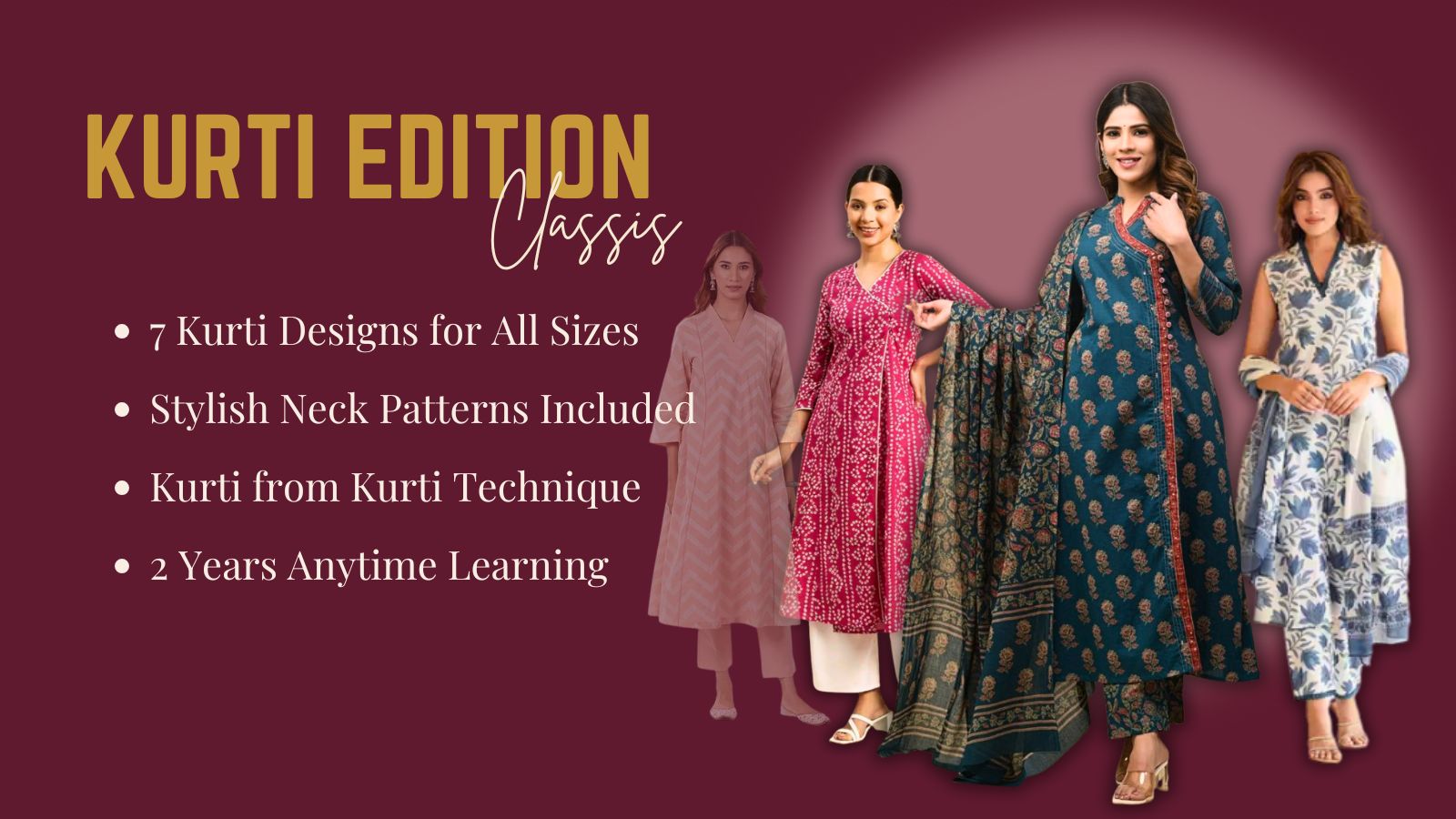 In this course, you will learn hoe to make 7 types of kurtis for both regular and heavy sizes